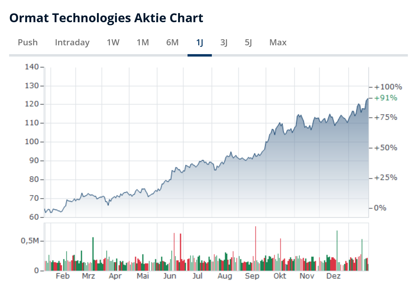 Grundsätzlich ist zudem die Volatilität im Sektor der erneuerbaren Energien zu berücksichtigen, die auch die Ormat Aktie in Sippenhaft nehmen kann. Zwar ist die Hauptnotierung an der NYSE (New York Stock Exchange) erfolgt, doch die meisten deutschen Handelsplätze wie Xetra haben die Aktie ebenfalls gelistet. Hier kann die Geld-Brief-Spanne (Spread) außerhalb der US-Handelszeiten allerdings deutlich schwanken und liegt selten unter 0,5 Prozent. In illiquiden Phasen kann diese Spanne außerordentlich zunehmen (> 2,5 %), sodass Käufe stets limitiert erfolgen sollten. Immerhin: Der Handel ist über nahezu jeden deutschen Broker möglich.