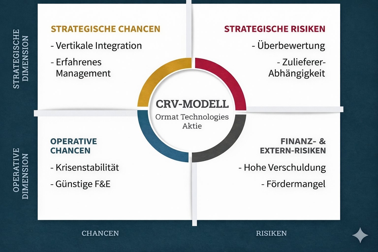 Batteriespeichersysteme als zentrales Bindeglied der Geschäftsbereiche bergen im Falle Ormats ein erhebliches Risiko. Algorithmische Fehlsteuerungen etwa können bei plötzlichen, heftigen Preisschwankungen am Energiemarkt fatale Arbitrage-Entscheidungen auslösen. Eine unkoordinierte Entladung der Speicher könnte dann nicht nur kurzzeitige, also finanzielle Folgen für Ormat haben. Reputationsschäden und Restriktionen, insbesondere in den USA, sind eine reelle Gefahr. Aufgrund der Cloud-Anbindung der Batterieeinheiten verschärft sich zudem das „Black-Box“-Problem, welches ein Eingreifen des Personals erschwert. Zu guter Letzt könnten sich die BESS-Systeme als ein unerwartet hoher Kostenpunkt erweisen: Die (Weiter-)Entwicklung der Algorithmen und vor allem der Kauf der Speicher birgt ein Finanzierungsrisiko. Zwar kann sich Ormat auf eine augenscheinlich zuverlässige Partnerschaft mit Samsung SDI berufen. Da jedoch ausschließlich die Südkoreaner als Lieferanten für Ormat agieren, ergeben sich im Falle von Tarifänderungen oder gar einer Vertragskündigung erhebliche Bezugsprobleme.