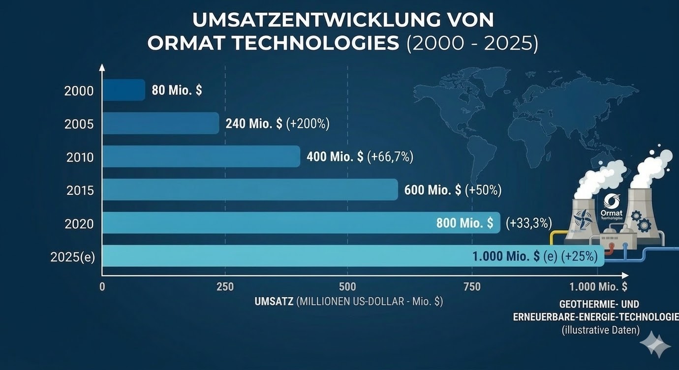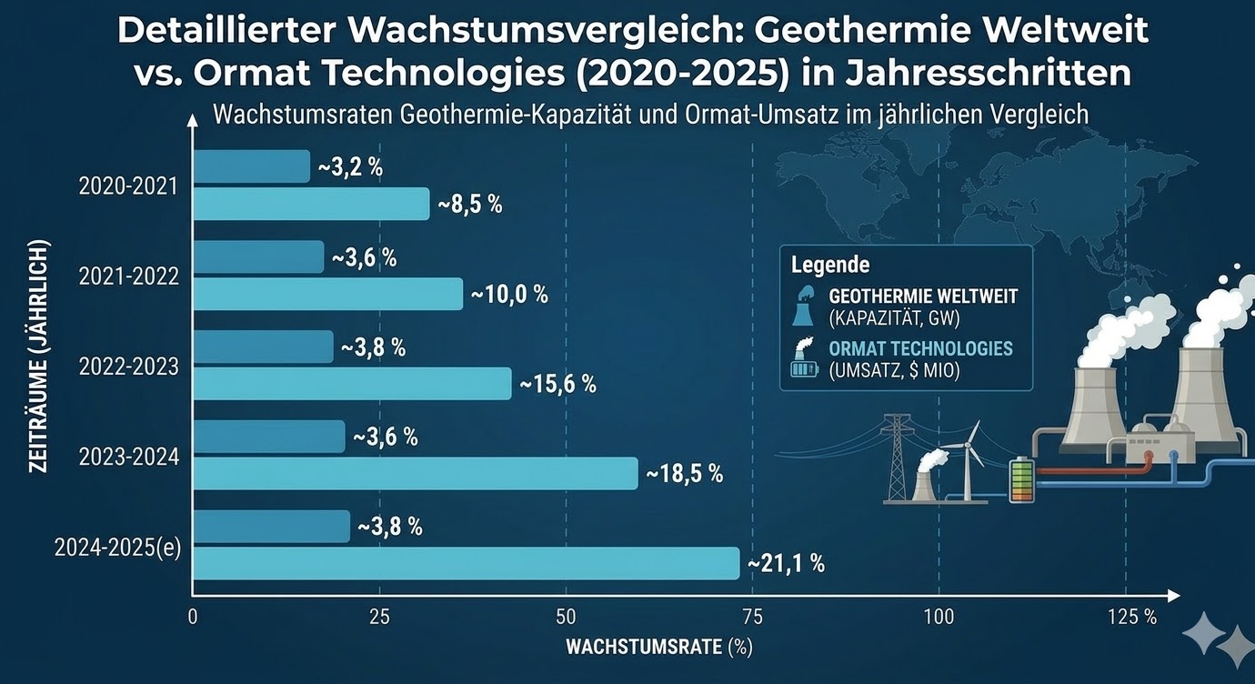Anbrechend mit dem GJ 2021 konnte sich Ormat vom allgemeinen Geothermie-Markt entkoppeln. Denn während das globale Wachstum für Erdwärmenutzung nahezu stagnierte, verzeichnete der Global Player eine nahezu exponentielle Entwicklung. Innerhalb von nur vier Jahren schnellte das Umsatzwachstum von zunächst 10 Prozent auf über 20 Prozent. Konkret steht, voraussichtlich, für das Jahr 2025 ein Konzernwachstum von 21,5 Prozent einem mauen Gesamtmarktwachstum von 3 Prozent gegenüber!