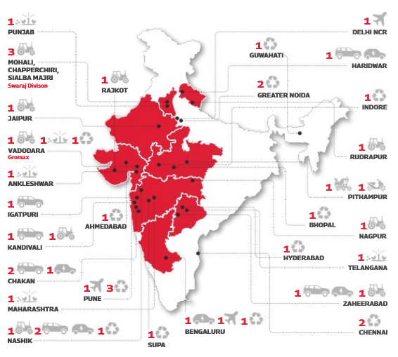 Automobile bilden das Rückgrat des Konzerns. Der Heimatmarkt gilt mit einem Umsatzanteil von 90 Prozent als entscheidend. Doch nur 13 von 47 Produktionsstätten befinden sich in Indien. Und: Knapp die Hälfte aller Standorte entfällt auf die Sparten Farming, Recycling und Renewable Energy! Quelle: Integrierter Jahresbericht der Mahindra & Mahindra Ltd. 2023/24.