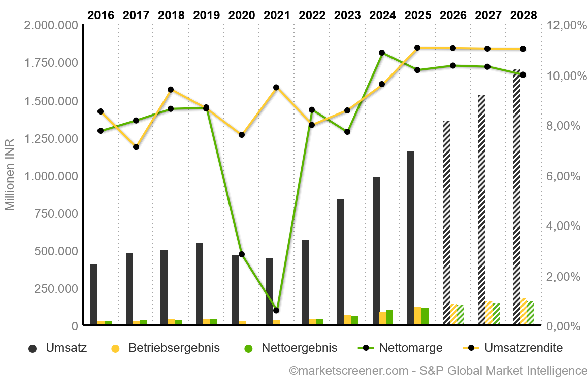 Ein Blick auf die Finanzen verrät schnell: Bei Mahindra & Mahindra handelt es sich um keinen klassischen Automobilkonzern. Mit Ausnahme der Coronapandemie stiegen und steigen Umsatz und Gewinn kontinuierlich an. So betrug der Umsatz 2016 noch 408,85 Milliarden INR und der Gewinn 31,68 Milliarden INR. Im abgelaufenen Geschäftsjahr (2025) wurden satte 1,59 Billionen INR beziehungsweise 129,29 Milliarden INR eingefahren! Dies ergibt ein durchschnittliches jährliches Umsatzwachstum von 8,6 Prozent und ein durchschnittliches jährliches Gewinnwachstum von 16,5 Prozent.