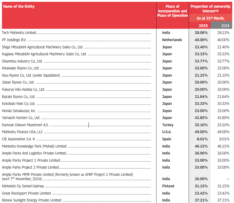 Die Unternehmensbeteiligungen von Mahindra & Mahindra reichen weit über die Landesgrenzen hinaus. Insgesamt füllt das Portfolio acht Seiten des jüngsten Konzernabschlusses. Quelle: Mahindra & Mahindra Limited. (2025). Integrated Annual Report and Financial Statements 2024–25. Mumbai: Mahindra Group, S. 418.